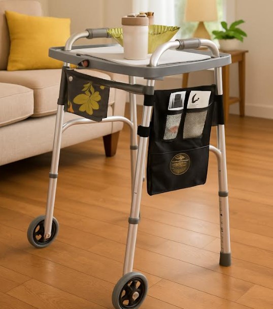 Mobility aids become even more effective when paired with practical accessories. A walker tray with a cup holder provides both functionality and convenience.